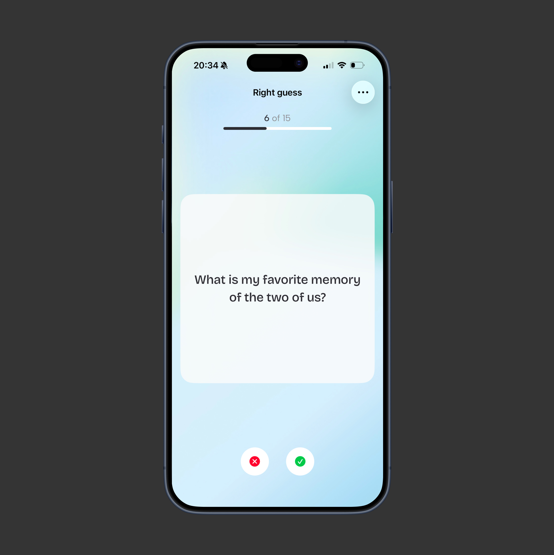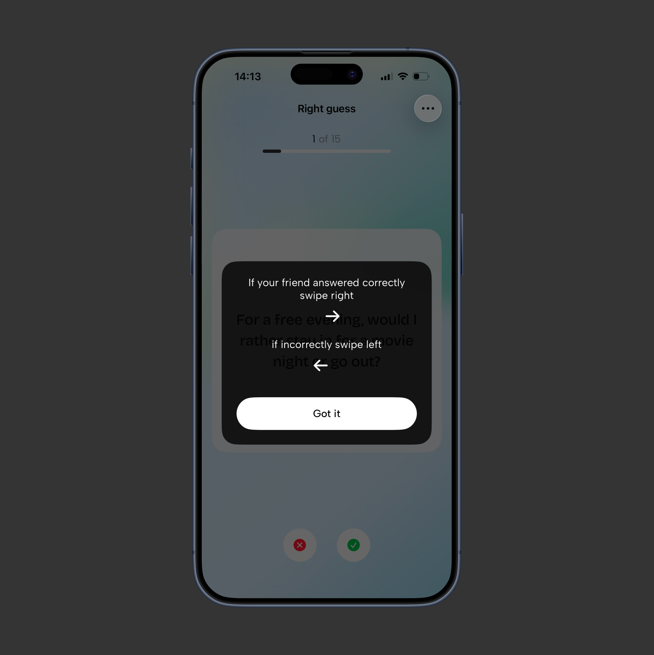 Right guess concept: the user answers questions about their friend or partner, who marks the answers as correct or incorrect, and the user earns points