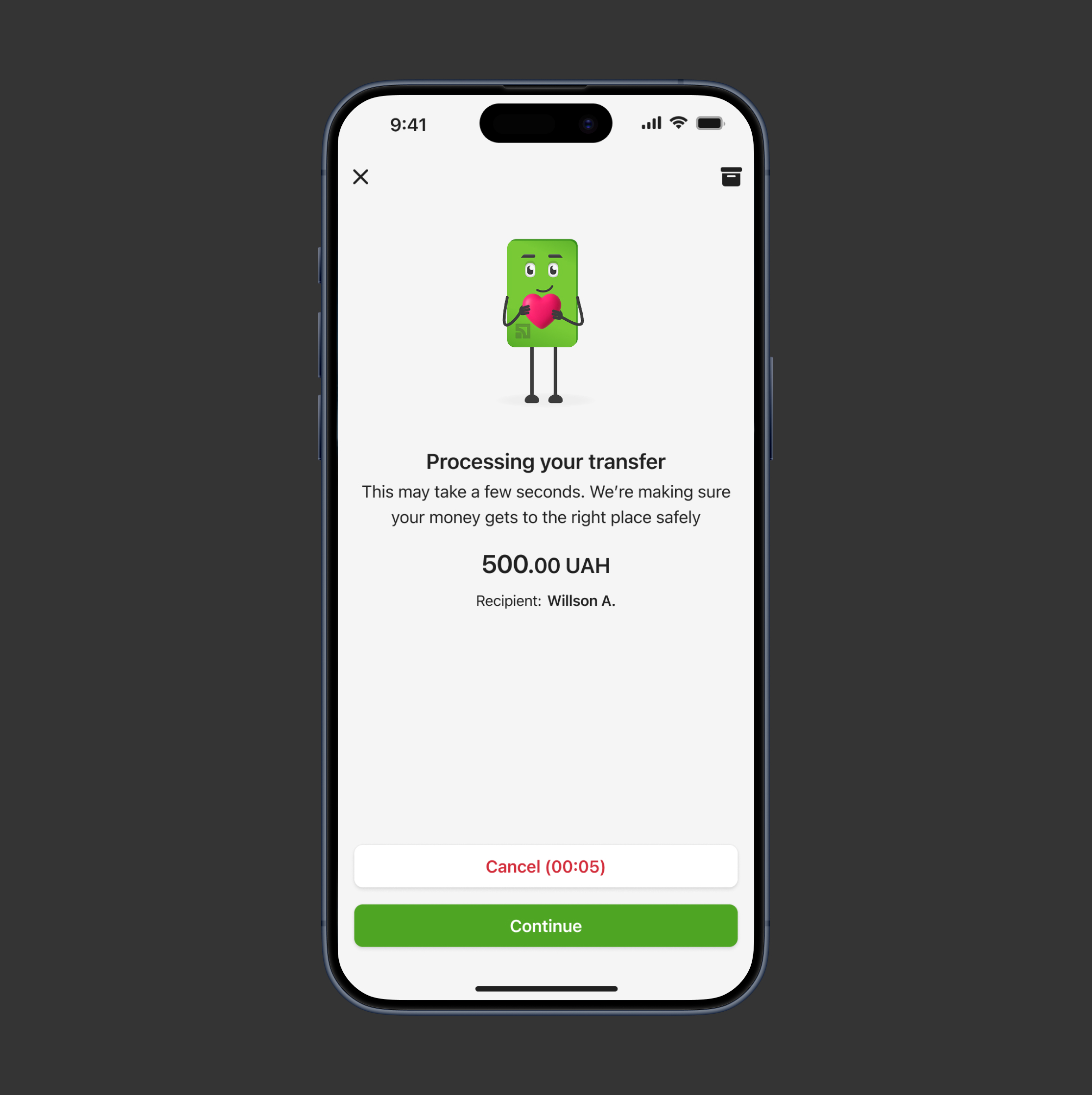 Provide a 5-second window to cancel the transfer after the user taps ‘Send transfer’ button