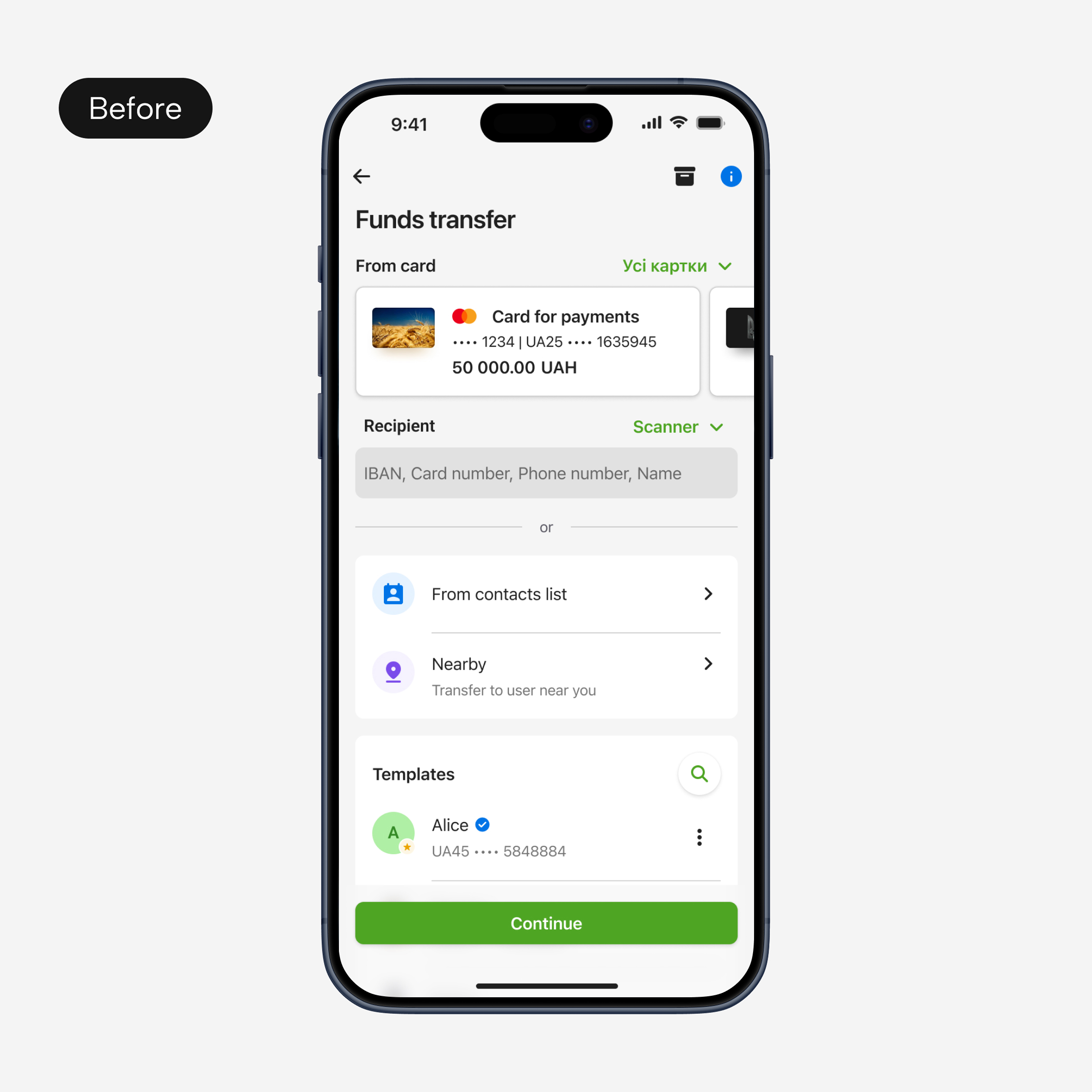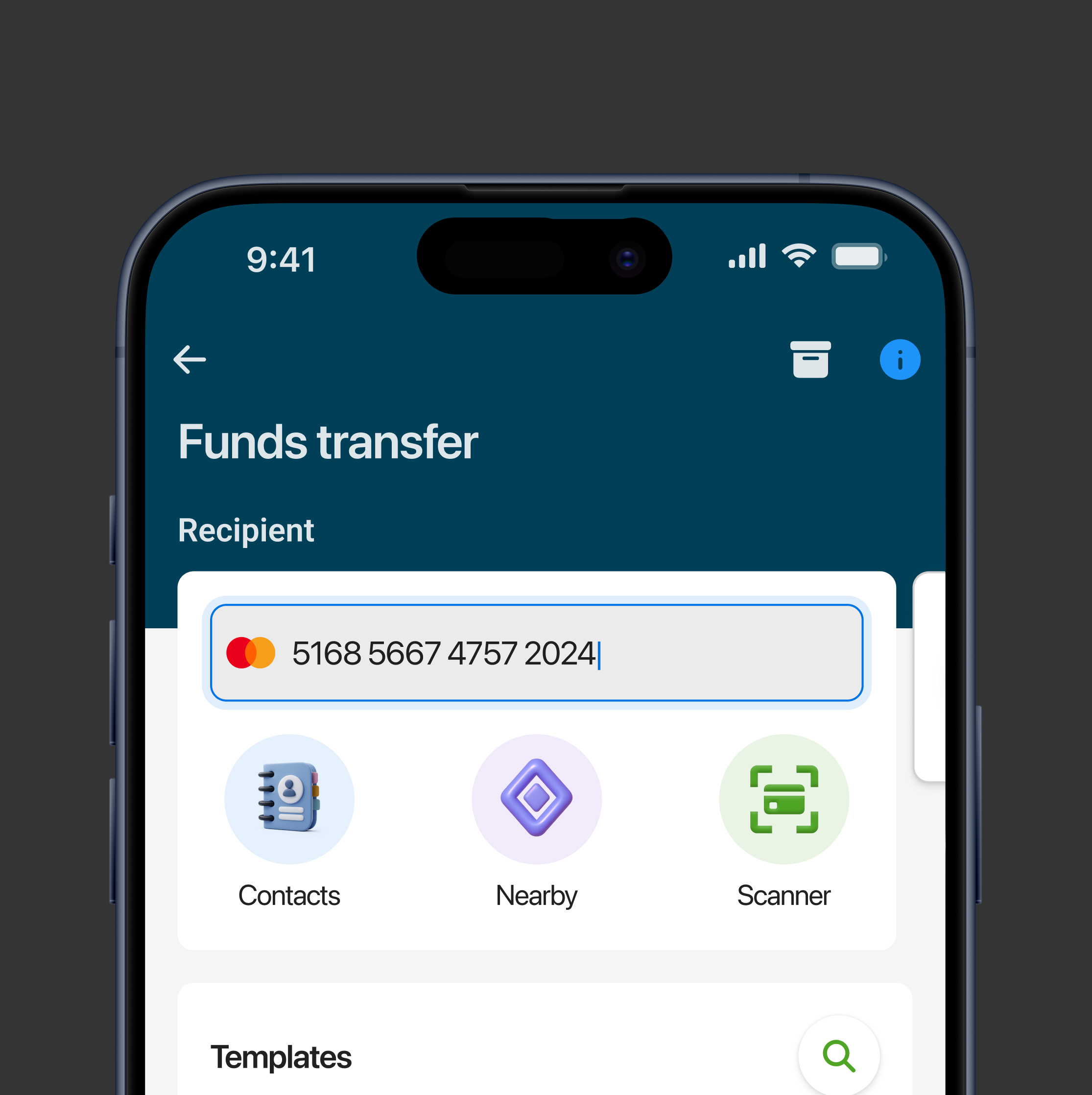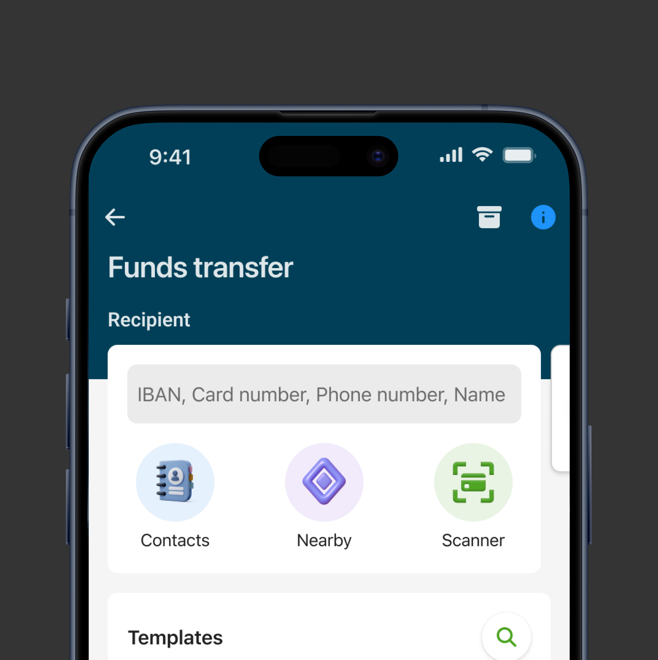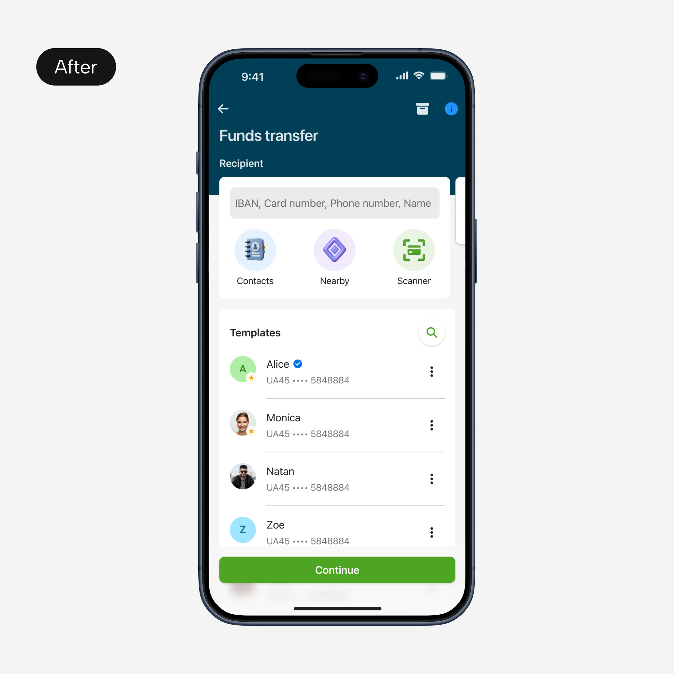 Allowed users to send money to people nearby or scan a card or IBAN for fast, accurate transfers with fewer errors