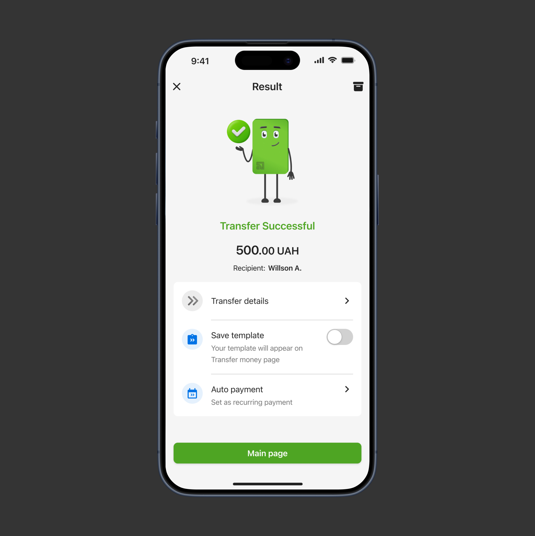 Transfer using IBAN, card number, phone number, or recipient name