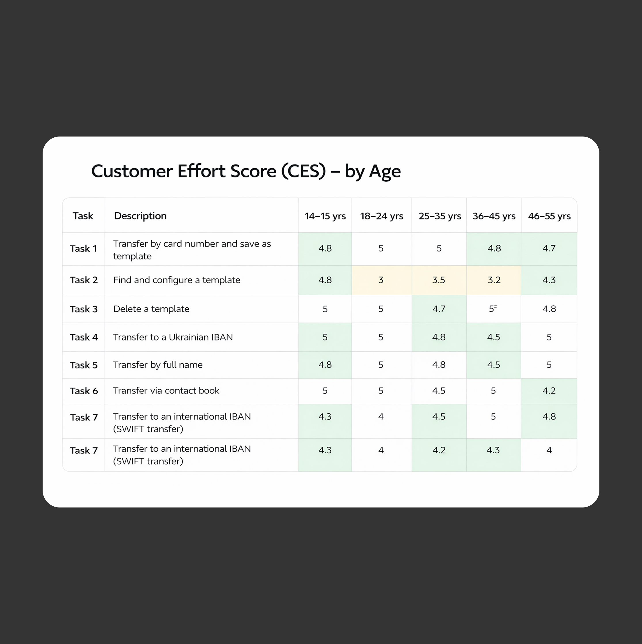 Most tasks achieved high performance scores (91–97%), indicating that users can complete primary transfer flows efficiently and with minimal friction